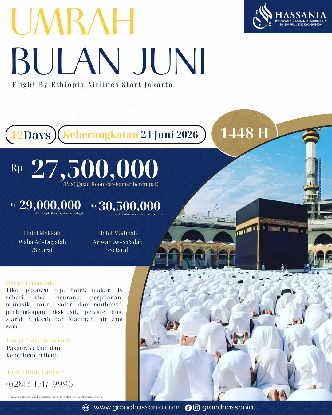 Nikmati perjalanan spiritual yang nyaman dan berkesan tapi dengan harga terjangkau melalui Promo Paket Umroh 12 Hari bersama kami. Program ini dirancang untuk memberikan pengalaman ibadah yang tenang dan tertata, mulai dari keberangkatan hingga kepulangan. Anda akan berangkat dari Bandara Soekarno-Hatta dengan penerbangan kelas ekonomi pulang-pergi, sudah termasuk bagasi, visa umroh, serta fasilitas lengkap yang menjamin kenyamanan selama di Tanah Suci. Setiap jamaah akan mendapatkan konsumsi 3 kali sehari dengan menu khas Indonesia, layanan transportasi private bus selama di Makkah dan Madinah, serta bimbingan langsung dari Tour Leader berpengalaman asal Indonesia dan Muthowwif profesional di Arab Saudi.